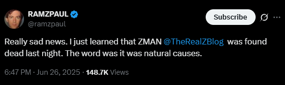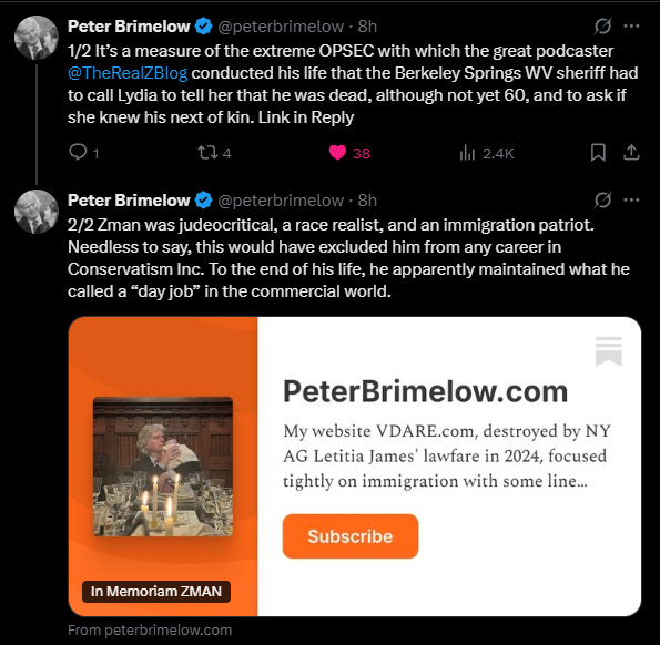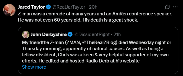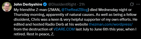 I didn’t agree with The Zman on every issue or position, the only person I agree with 100% of the time is the handsome devil looking back at me in the mirror, but I agreed with him almost all of the time. He epitomized the Dissident Right, being someone focused on what really is and not what we wish would be.