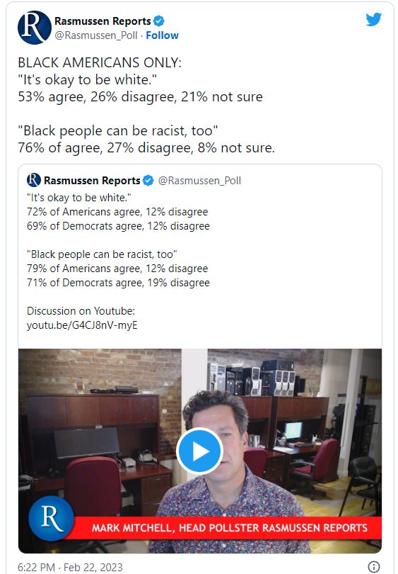 The basic gist of what Scott is saying has to do with a Rasmussen poll that asks a few questions, one being “It’s OK to be White?”. The response: